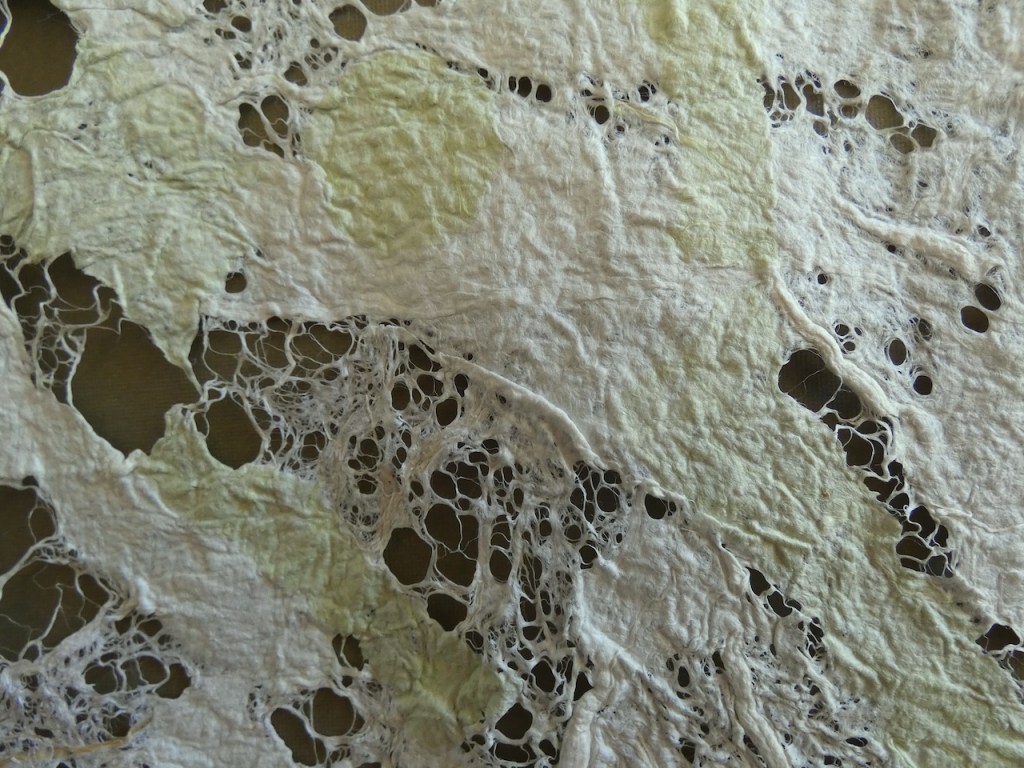 Joomchi is a Korean practice of using only water and an ancient technique to fuse multiple layers of mulberry paper together, making unique textured artworks.